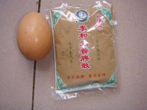 首先,介绍下原料:新鲜猪肚1个(呵呵,家里是买农家猪滴),1包永春李和元养脾散,6个鸡蛋 ,食盐