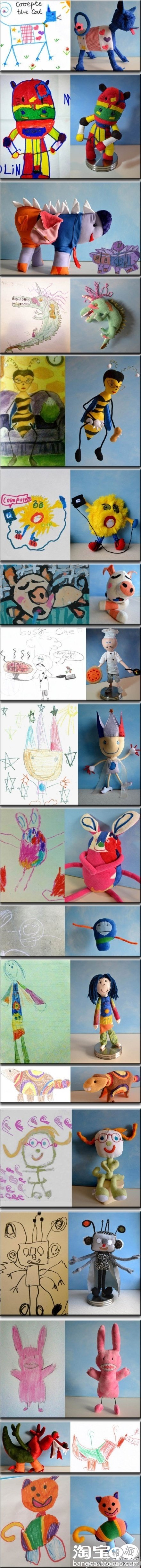 微博上看到的,一位母亲把她四岁儿子的涂鸦做成长毛绒玩具。好有爱啊