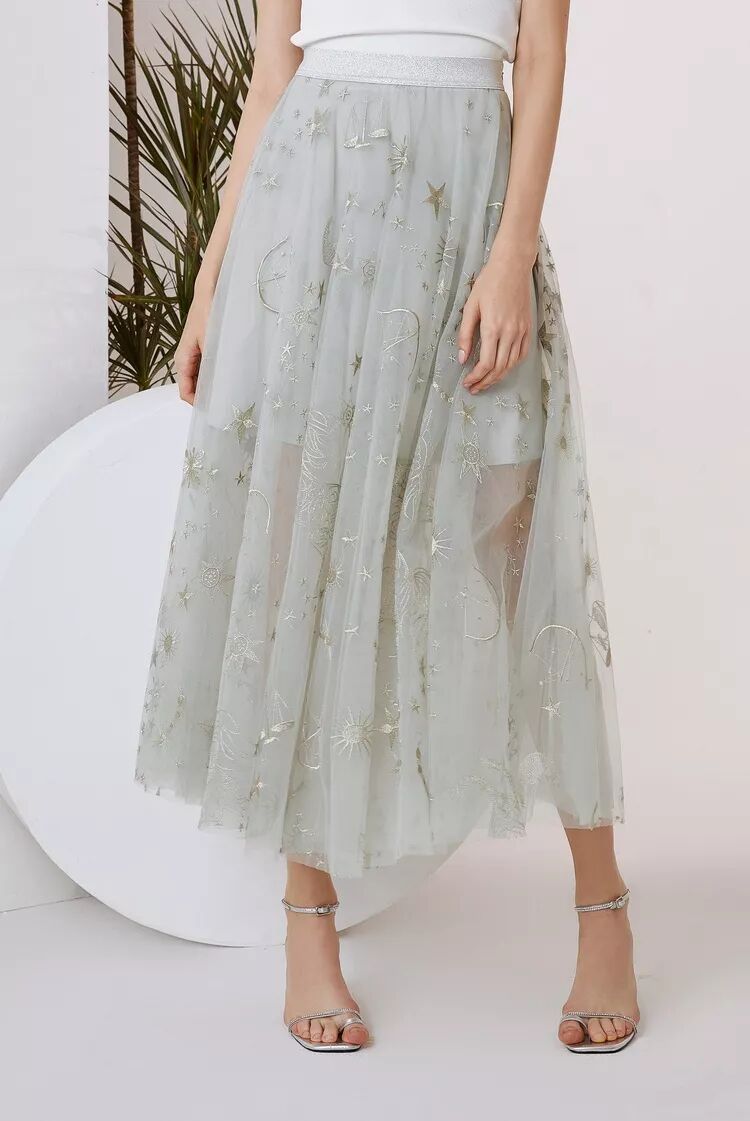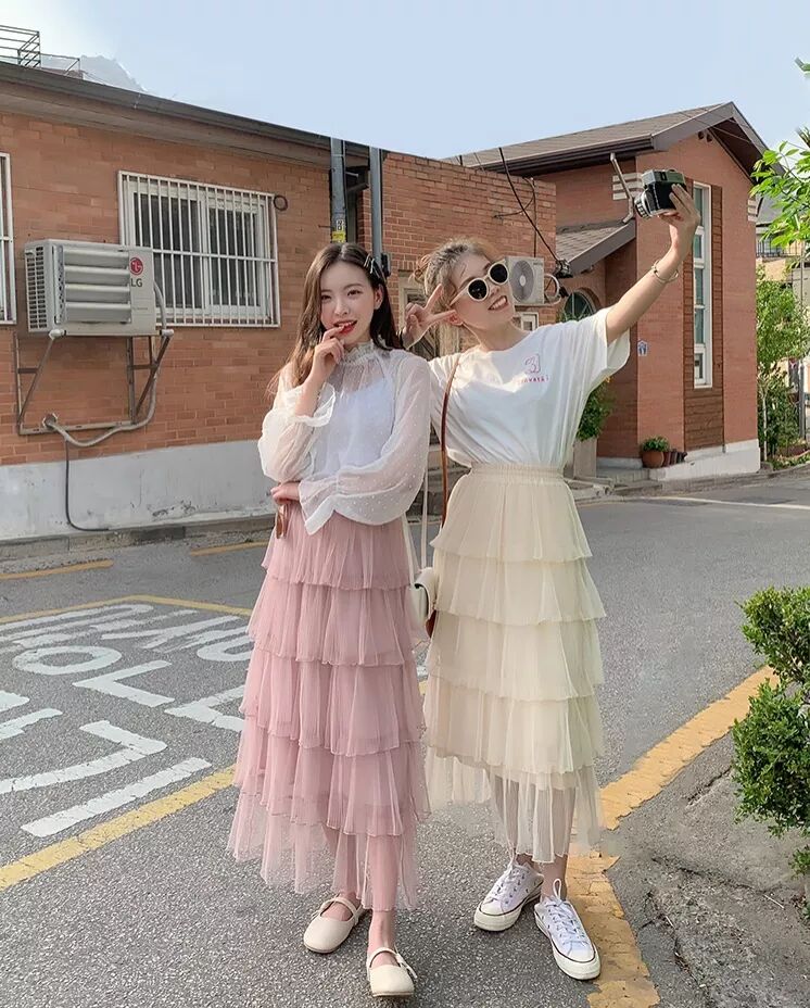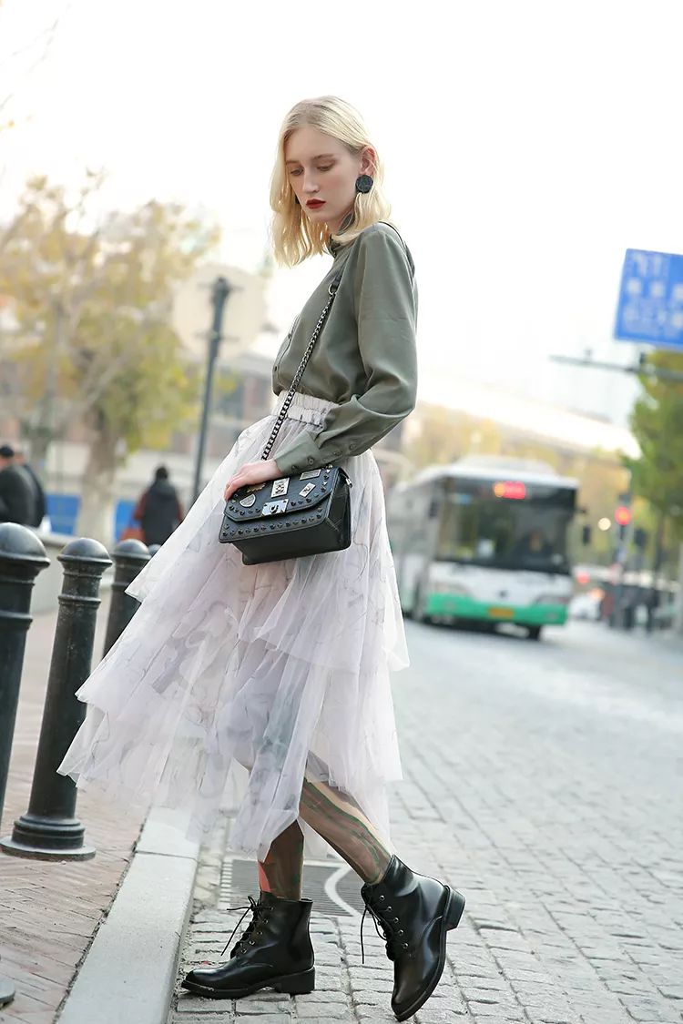说到长裙,当然少不了甜美的蛋糕裙(也称塔裙)。用飘逸的薄纱堆叠而成,轻盈柔美还有甜甜少女感,最重要的是让整体造型有层次还不显胖呢~