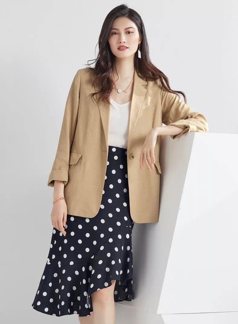 何穗这条波点鱼尾裙搭配西装外套,在展现女性的柔美和浪漫的同时多了一分干练。