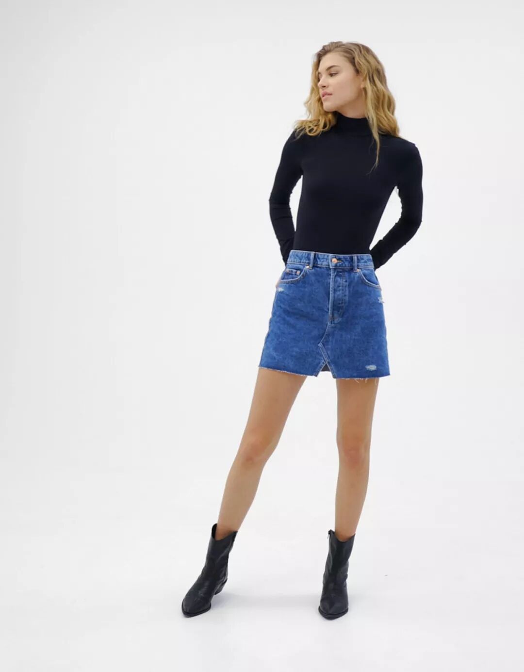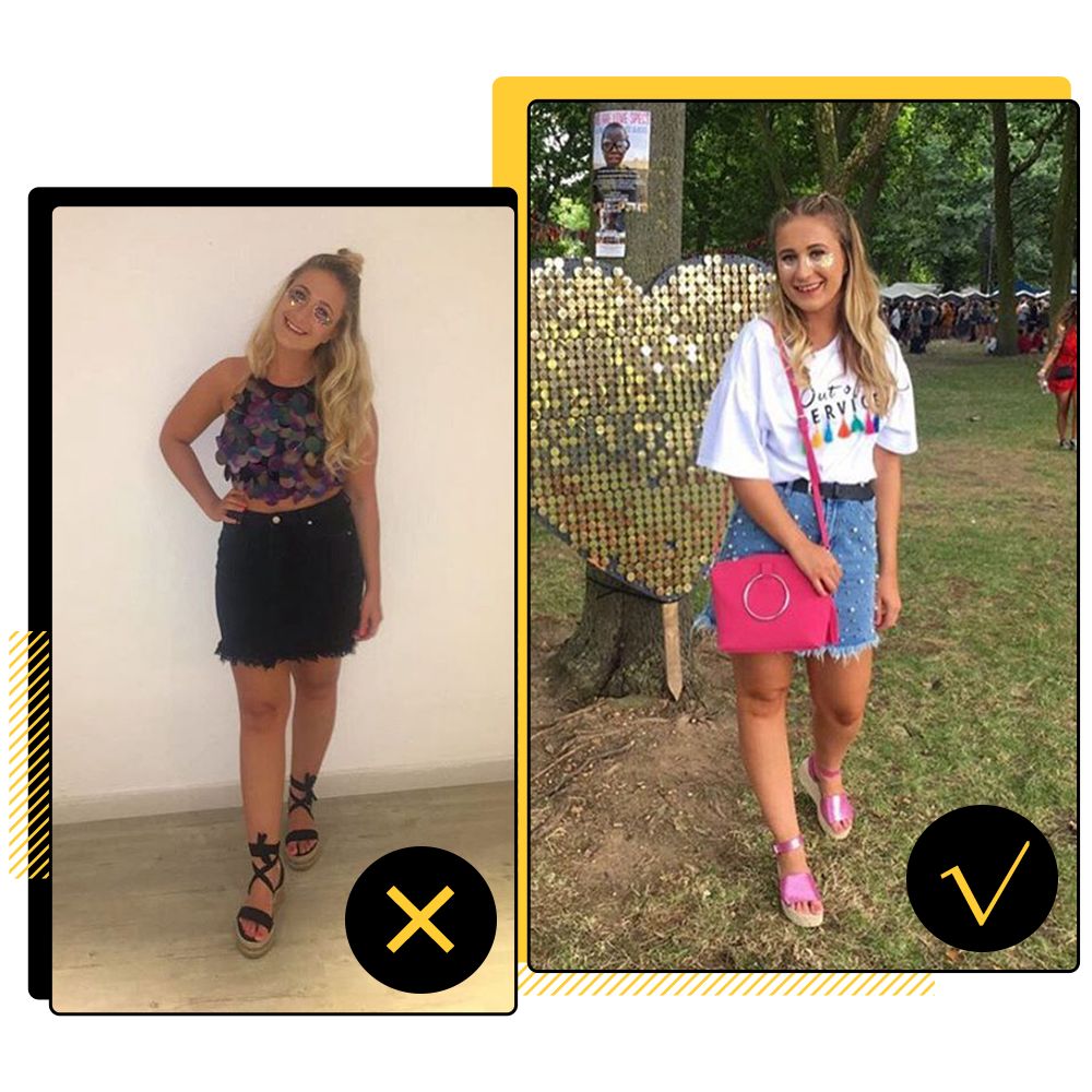 像左边这种包臀裙显得屁股又宽又大,没有腰身而且特别显胖,感觉全身黑漆漆的沉闷又显老。而当小仙女换上右边牛仔A字短裙搭配上小白T,马上就充满了青春活力,颜色分明小清新,俏皮又可爱,感觉变嫩不少了呢~